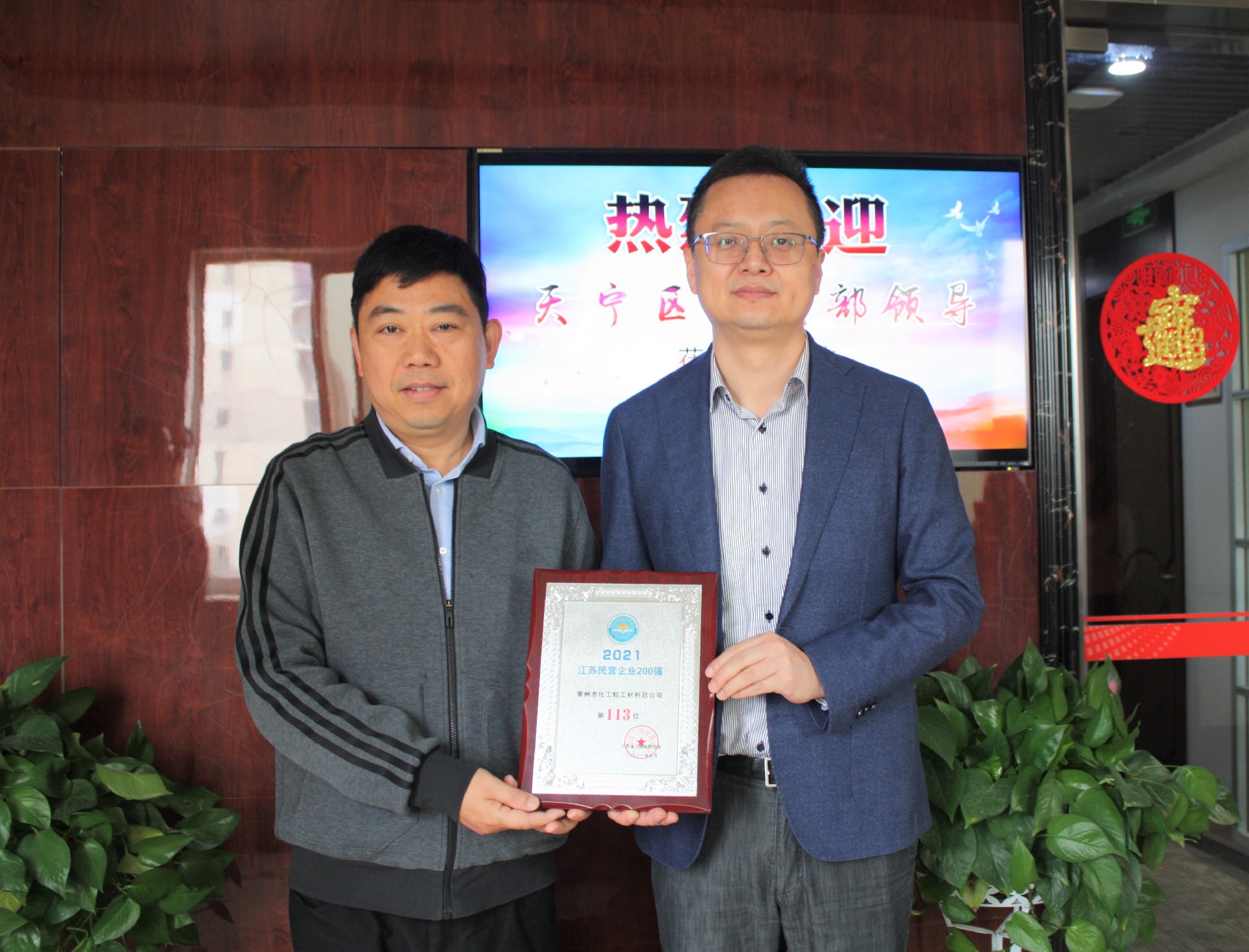 11月17日上午,天寧區委常委、統戰部部長倪云澤,副部長兼工商聯黨組書記徐麗燕等一行三人來總公司調研指導工作,專程送上了“2021江蘇民營企業200強”榮譽獎牌,并考察了大院內引進的文創項目。&nbs···